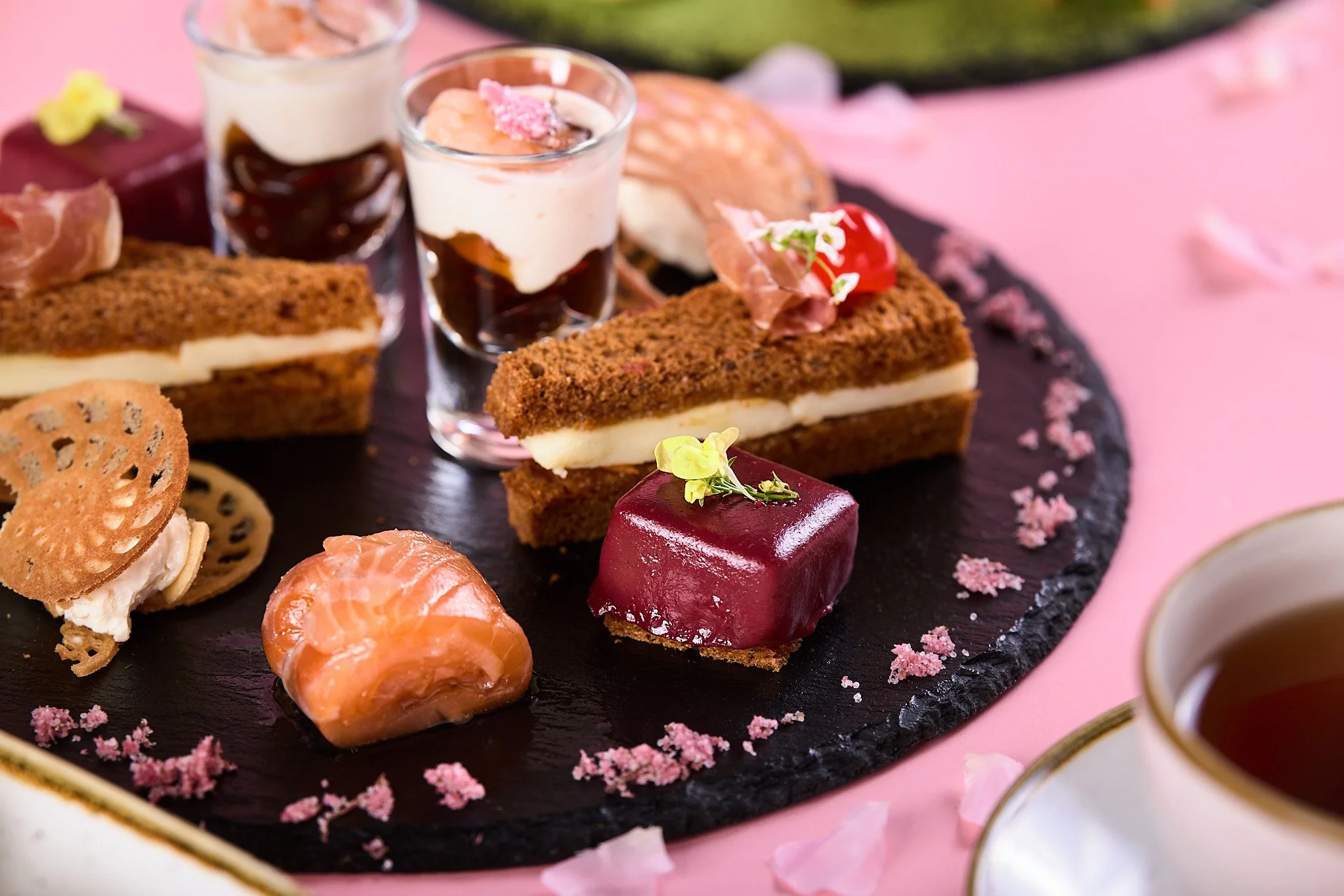 ・ サーモンマリネと大根のルーロ、桜フレッシュクリーム