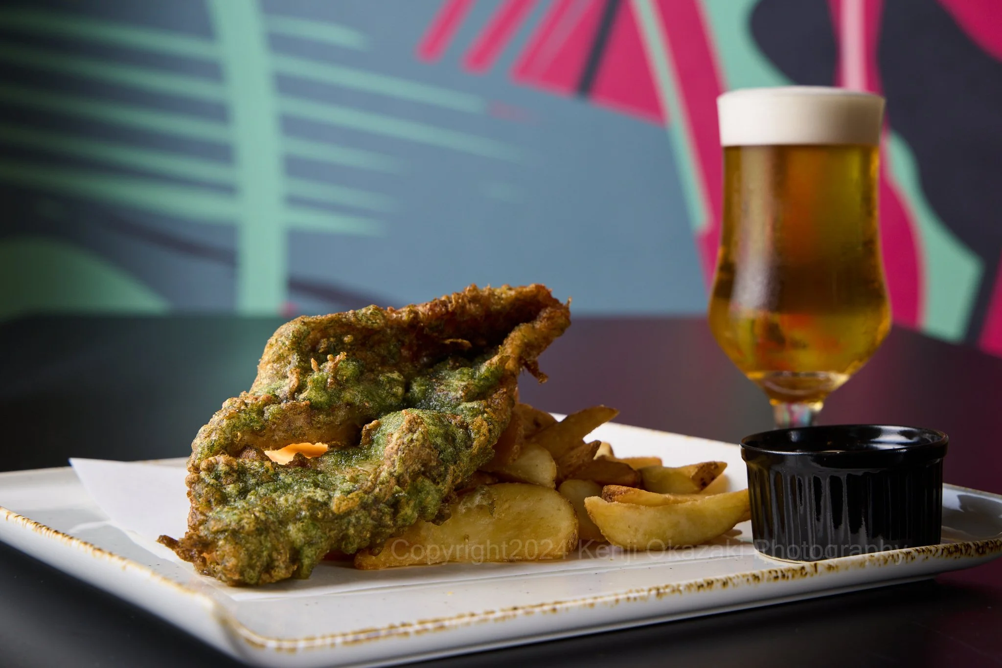 青のりを衣に加えた和テイストのフィッシュ&チップス。ビールやハイボールと相性抜群!
